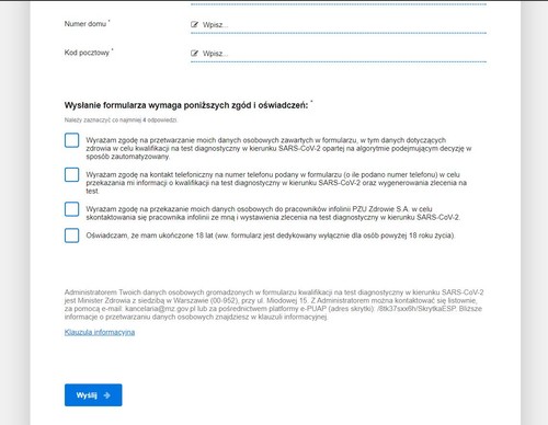Prosimy abyś złożył formularz w tych godzinach. Wybierasz sytuację z powodu której chcesz wykonać test. Jako rodzic lub opiekun masz upoważnienie do wykonywania czynności za pośrednictwem Internetowego Konta Pacjenta w imieniu Twojego dziecka lub osoby która nie umie się samodzielnie zarejestrować a.